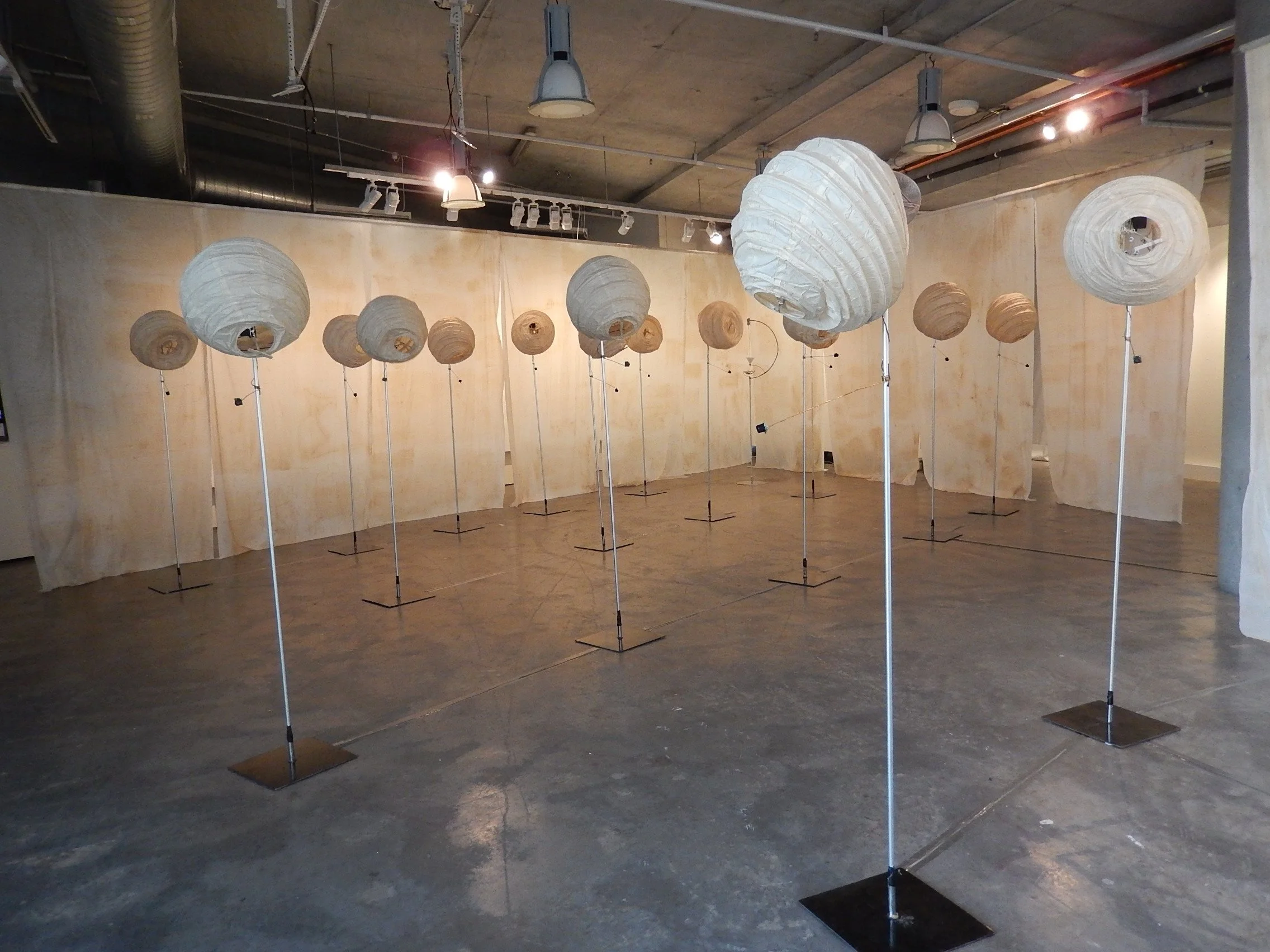 The pod array expresses a body of interactive and programmed robotics dressed in chinese paper lampshades to express precisely calibrated amounts of smells. Each lampshade houses a pump that expresses a mixture of air and smell molecules in a certain ratio via articulated arms controlled by servos controlled by a microprocessor programmed to correspond to ultrasonic distances. When activated the mechanism delivers a concentration of smell without leaving a residual smell, allowing the experiences and perception of difference, similarity and sequence of odiferous materials. Since 1952 when Ernest Beaux, perfumer wrote ‘The future of perfumery is in the hands of chemistry’ many novel olfactory molecules have been designed and created for the perfuming and deodorising of bodies, possessions, environment and food, as well as technological means to detect them. Olfactory molecules by nature are aerosols. Contemporary studies of biological aerosol particles, scientifically investigated since the nineteenth century, may lead to a better understanding of their role in climate and atmospheric processes and may also help to improve understanding of their impacts on humans.