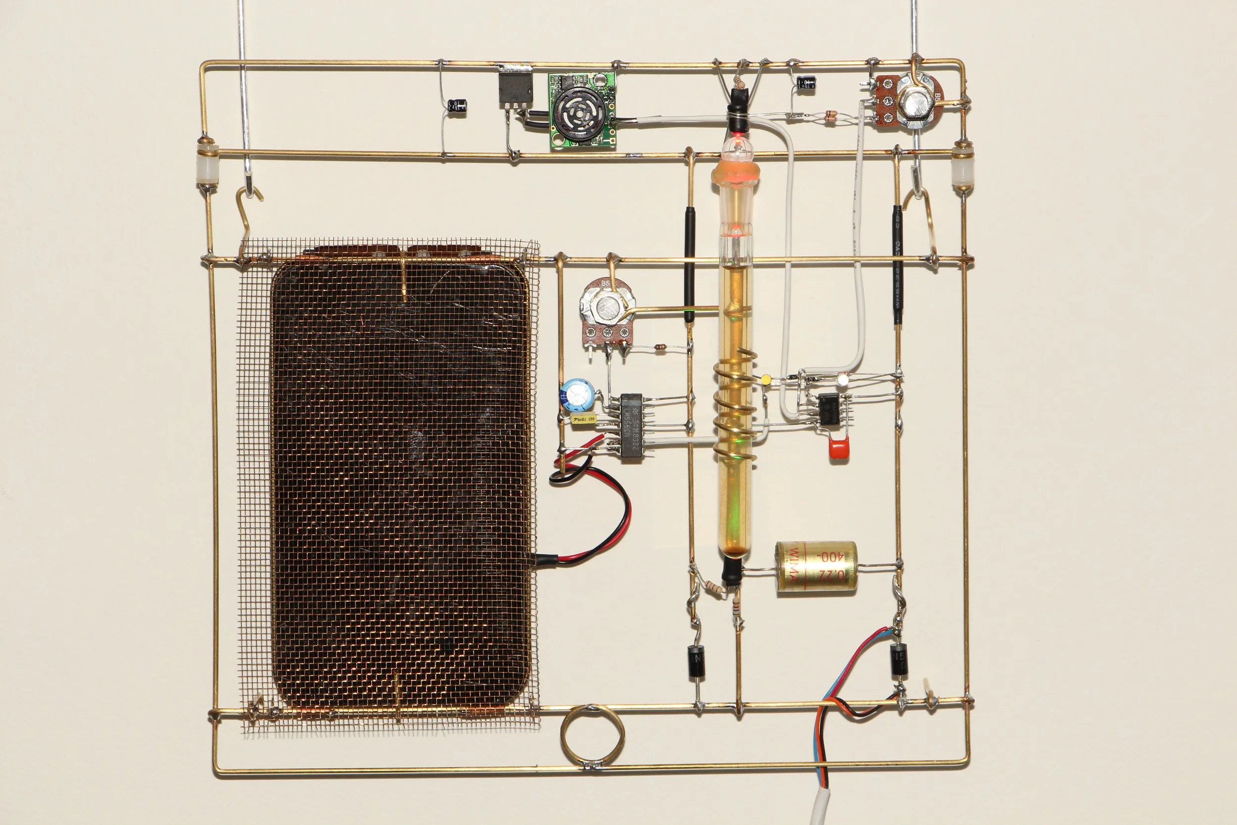 The botanical perfume, sealed in a flask for a future time, recalls a tenebrous memory of the fragrance of mushroom picking at dawn, flowers growing in ditches, and the smell of the milkman’s horses. Its set within the interactive electronic circuit laid out to represent its schematic diagram within which are two integrated circuits. The invention of the integrated circuit allowed intelligence to be added to everyday items. Integrated circuits can make decisions and synthesise memory.