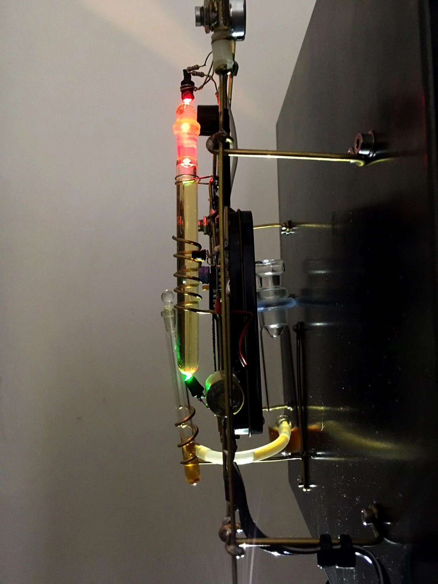 When the glass dipstick is drawn from the test tube to sample the mixed fragrance of ionones, the circuit senses the presence of a person and begins to emit an earthy musk fragrance.